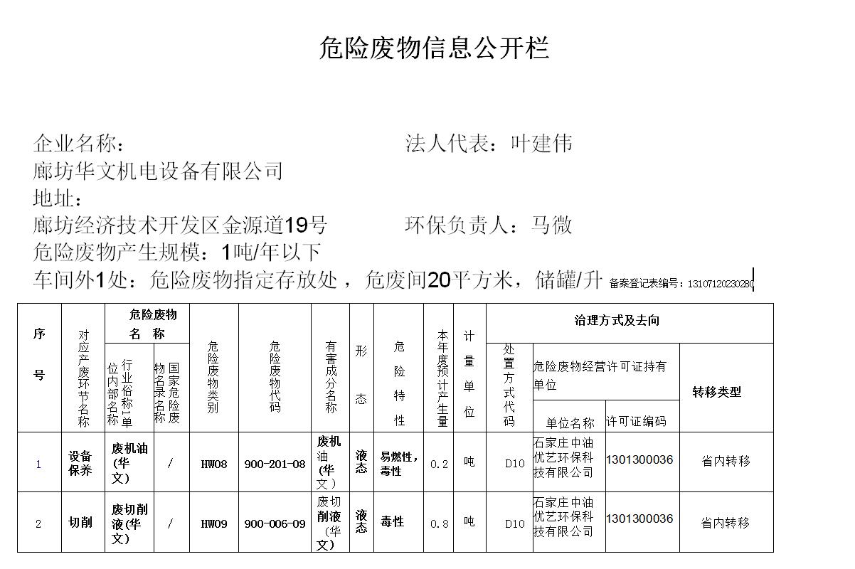 企業名稱:法人代表:葉建偉 廊坊華文機電設備有限公司 地址: 廊坊開發區花園道20號 環保負責人:張景坡 危險...